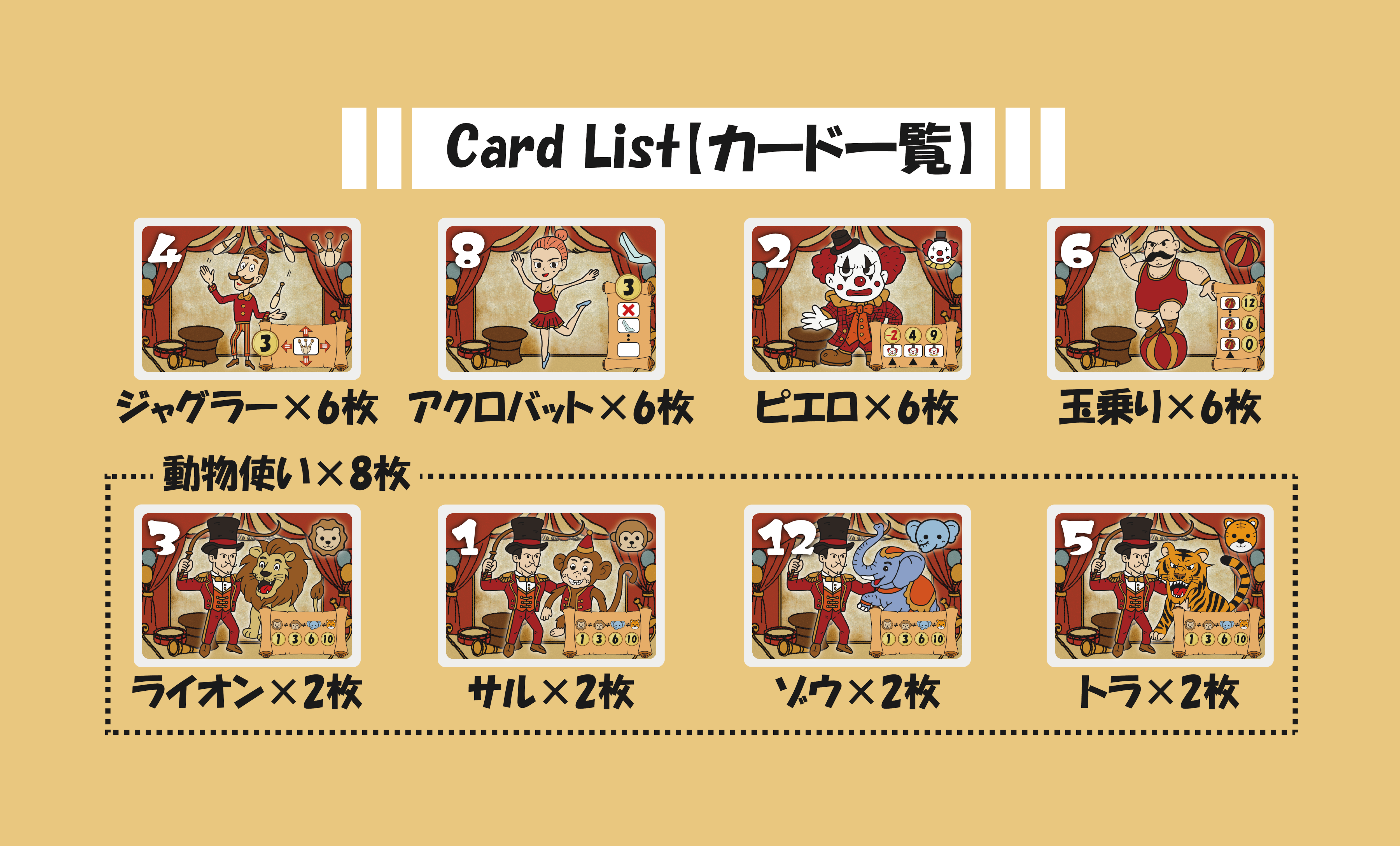 カードにはアクロバット、ジャグラー、ピエロ、玉乗り、動物使いというキャラクターがおり、ユニークな得点方法となっています。
